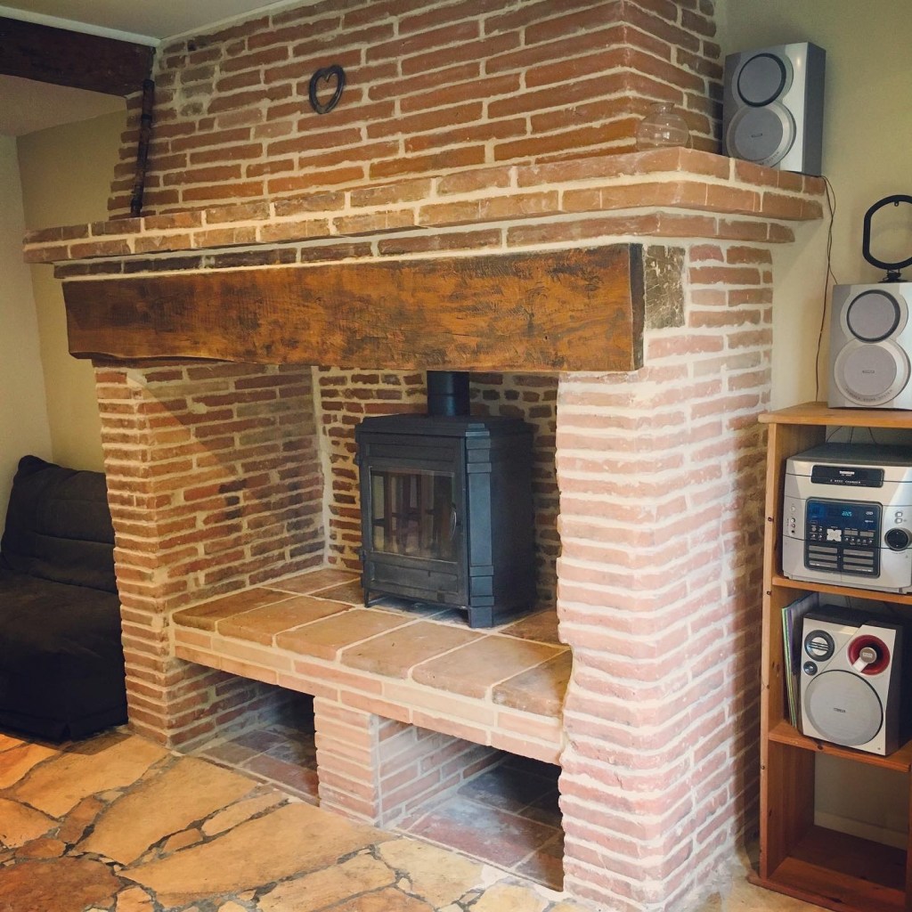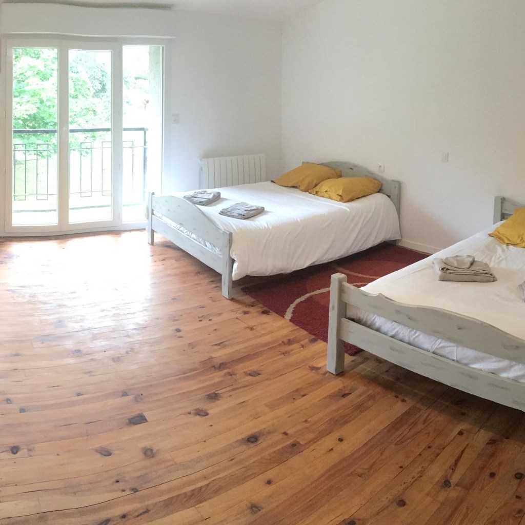 2 : 22m² avec 2 lits doubles et 1 lit simple autour d’un superbe conduit de cheminée en briques,